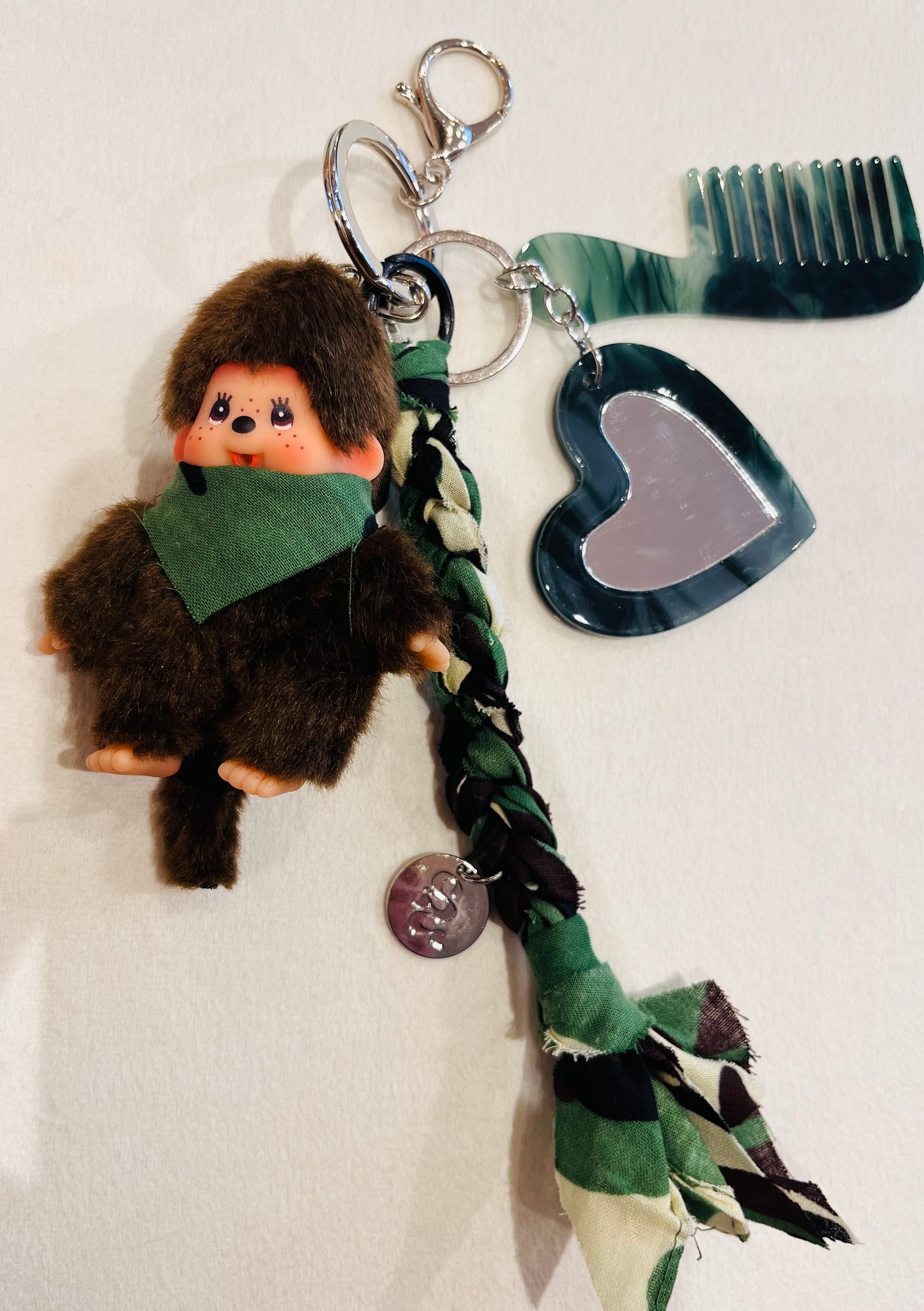 Kiki version iconique, foulard tressé camouflage, peigne assorti et véritable miroir en forme de cœur intégré.
