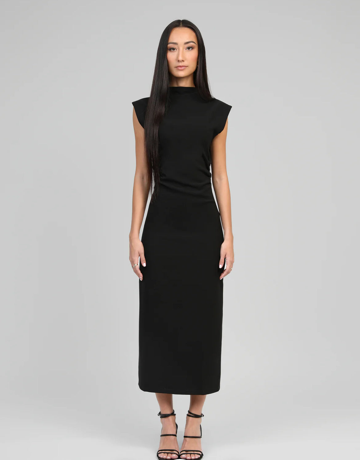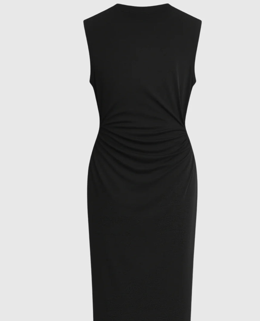Robe longue sans manches avec col montant, silhouette près du corps, détails froncés aux côtes et aux épaules. Longueur totale de 125 cm. Disponible du S au XL. Composition : 90 % polyester, 10 % élasthanne. Entretien recommandé : lavage à la main ou nettoyage à sec.